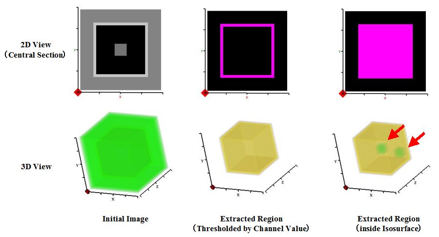 MyriaViewにおける領域抽出は、指定した表示チャンネルから得られる画素値についての、等値面内領域の抽出を基本とします。簡便な領域抽出法として現在も広く用いられる、画素値を基準とする閾値処理では、閾値範囲外の領域は除外されるため、注目する領域の内部に評価外となる領域が生じる場合があります。MyriaViewでは、空洞領域が存在する場合も含めて等値面内領域を全て抽出することが可能となります。