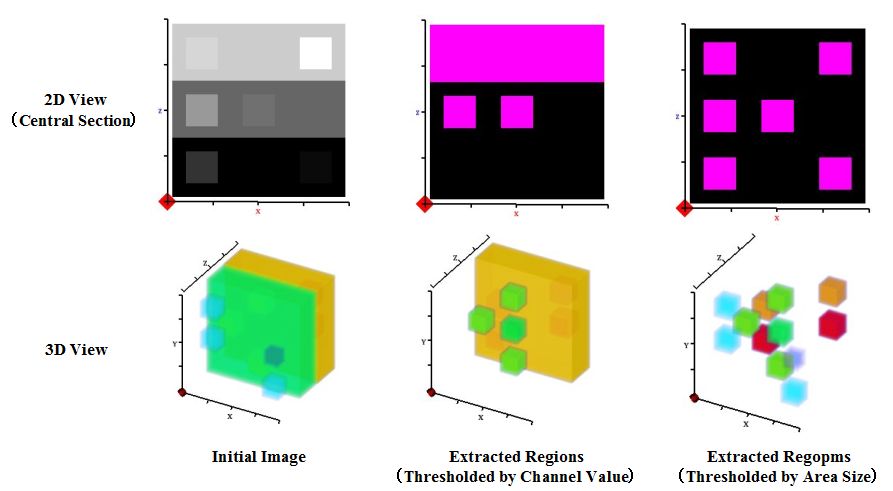 MyriaViewでは、等値面内領域のサイズを基準とした閾値処理により領域を抽出することが出来ます。これにより、注目する対象の領域サイズが予測可能な場合には、等値面の画素値に関わらず領域抽出が可能となります。