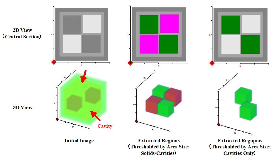 MyriaViewで等値面内領域を抽出する際、等値面内/外がそれぞれ前景/背景となる場合(実領域)と背景/前景となる場合(空洞領域)のいずれも抽出対象となります。この時、実領域と空洞領域のいずれか一方のみを選択して抽出することが可能です。