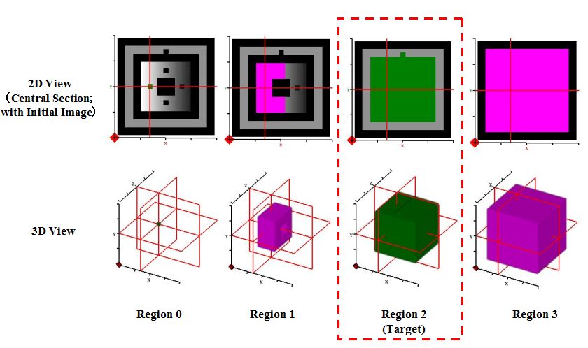 MyriaViewではカーソルにより指定された位置を含む個別領域を抽出できます。条件を満たす領域をサイズに従って小さいものから順に配列すると、これらはカーソル周辺で単調に外部へ拡張する形をとります。従って、拡張の傾向を目視することで配列中から所望の領域を選択することができます。